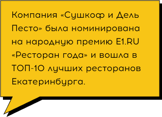Благодаря ценностям, принятым в Сушкоф и Дель Песто, создаём вкуснейшие блюда, делаем крутой сервис и становимся лучше с каждым днем. Если ты разделяешь эти ценности, значит, нам точно по пути!